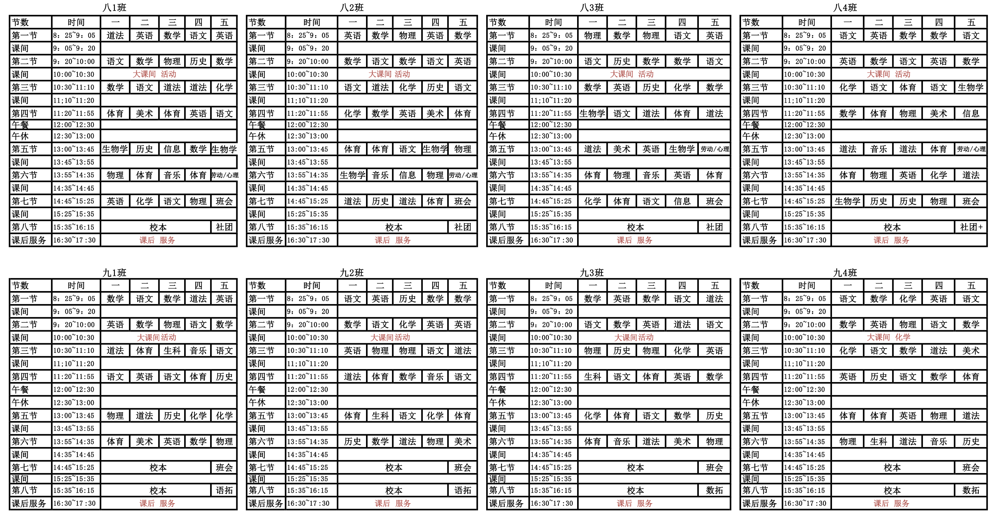 2025学年第一学期初中部班级课表