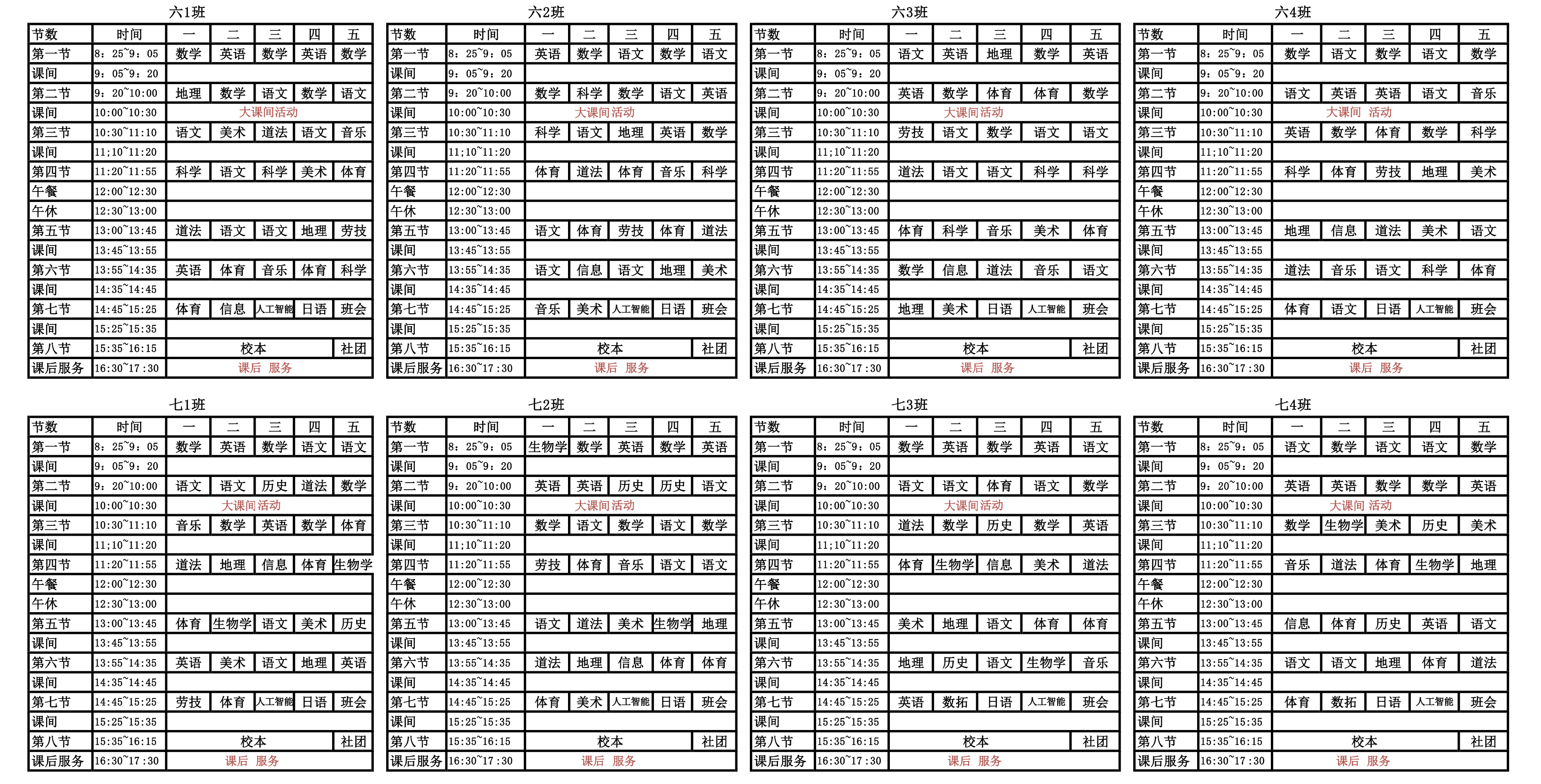2025学年第一学期初中部班级课表